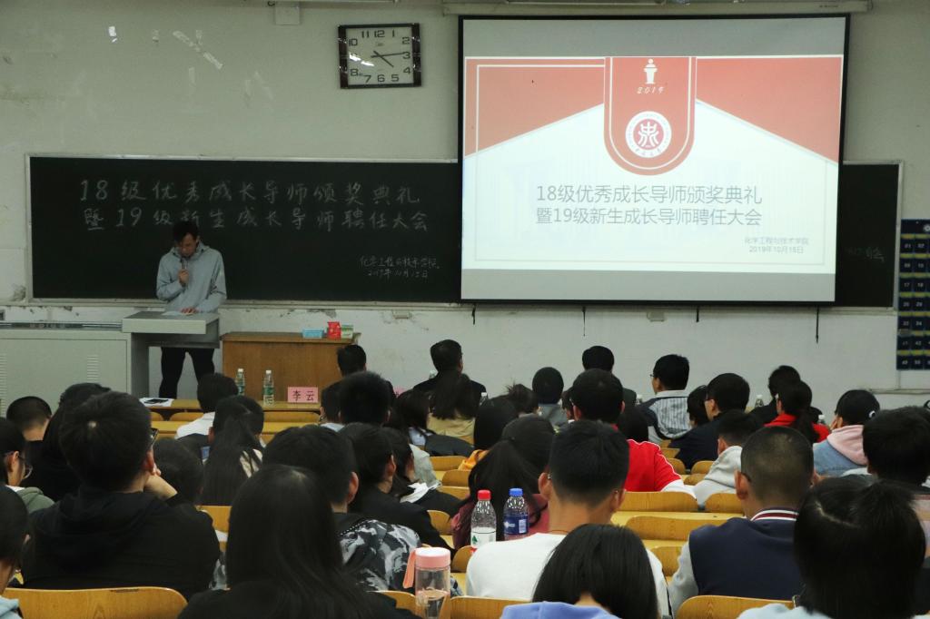会议伊始,导师代表赵林秀老师为同学们举例说明了工科毕业生在就业方面的优势,同时也向学生们阐述了成长导师的职责并代表老师给予同学们美好的祝福。新生代表赵姝聪表达了作为新生的迷茫并希望导师们用他们的专业素养和丰富的阅历引导我们,呼吁同学们做心怀民族,心怀国家的社会主义新青年,不畏山高路远,砥砺前行,相信有着诗和远方,永葆初心,坚定信念。随后为2018级9名优秀成长导师颁发荣誉证书,宣读了2018级工作合格名单,并为2019级22位成长导师颁发了聘书。
