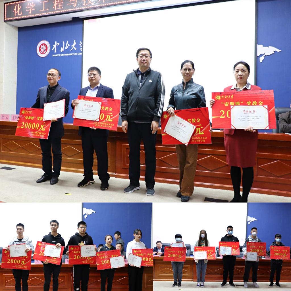 院党委书记廖海洪宣读第一届“帝斯博”奖教金获奖名单,刘俊副校长为程原、李裕、王香梅、袁志国四位老师颁奖;胡志勇副院长宣读第一届“美涂化工”新生奖学金获奖名单,美涂化工校友李利明为获得奖学金的成逸申、李帅成、裴毅飞、宣凯欣、高鑫、王茜、李俊熙、朱家伟、刘文硕、王克瑛十位同学颁奖。