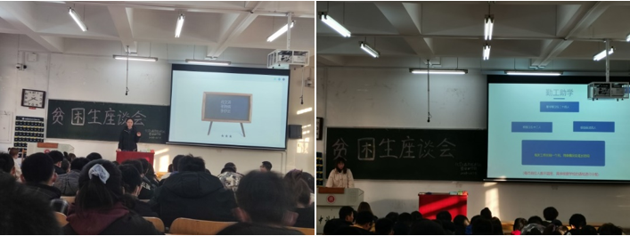 本次座谈会的目的是为了让同学们更好的了解和争取自身权益。首先,杨越,郝俊宏,范鹏妍,魏志进分别就各类资助、贫困生认定、励志奖学金、勤工助学和助学贷款等做了讲解,同时介绍了资困助学部的工作性质及内容,让同学们认识和了解到贫困生特有的勤工助学和奖项,并解答了同学们的各种疑问。