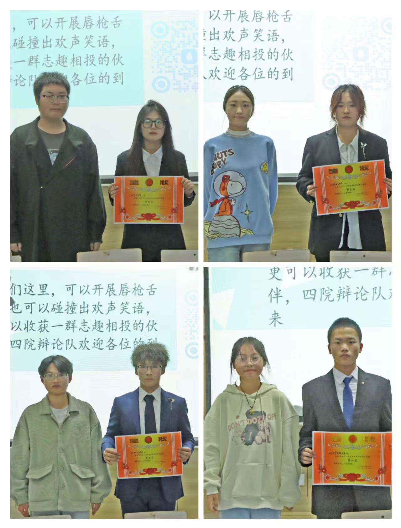 最后由评委进行评分,评选出本次活动各队的名次。荣获冠军的是摸鱼小队,荣获亚军的是猛男说的队,获得季军的是瑞赛棒赛贝勒队,殿军则被花开富贵队收入囊中。最后由言知辩论社社长罗静怡为获奖团队颁奖。
