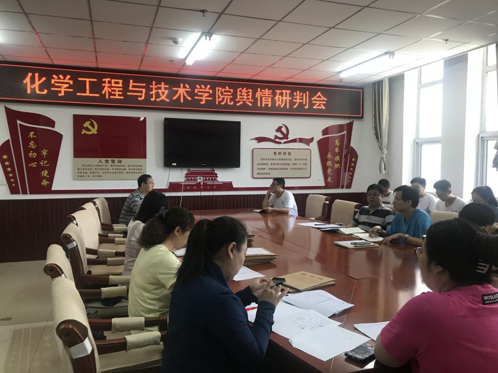 为认真贯彻落实习近平总书记在全国高校思想政治工作会议和学校思想政治理论课教师座谈会上的重要讲话精神,引导广大师生树立正确的网络安全观,全面贯彻落实总体国家安全观,加强网上正面宣传,旗帜鲜明坚持正确政治方向、舆论导向、价值取向,积极培育和践行社会主义核心价值观,构建网上网下同心圆,2019年6月6日上午10点,化学工程与技术学院于科学楼C座党员之家召开了学院舆情研判会。会议由院党委书记廖海洪主持,学院意识形态领导工作组,各党支部宣传委员,网络评论员参加了此次会议。