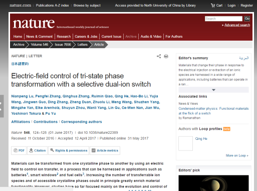 2008届优秀毕业生鲁年鹏以第一作者身份在《Nature》杂志发表题为Electric-field control of tri-state phase transformation with a selective dual-ion switch的研究论文,在国际上首次报道电场诱导下的双离子调控可逆结构相变,发现了全新的物相,并揭示了相变所对应三种结构的奇异光学、电学和磁学特性,为电场调控光、电和磁性的器件应用提供了全新的可能。
