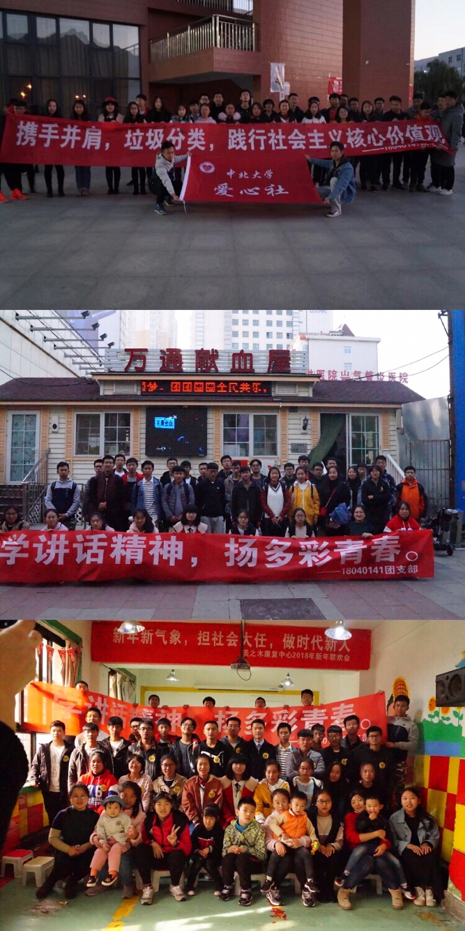 爱心社联合太原市二十所高校,倡议学生进行垃圾分类。10月31日,18040141团支部在龙山餐厅门口对来往学生进行了垃圾分类的宣传普及,动员大家参与垃圾分类线上答题;11月1日,他们发起了“一周生活垃圾分类挑战”,将不可回收垃圾扔掉并将可回收垃圾送给宿舍门口老大爷,提高同学们的垃圾分类意识。
