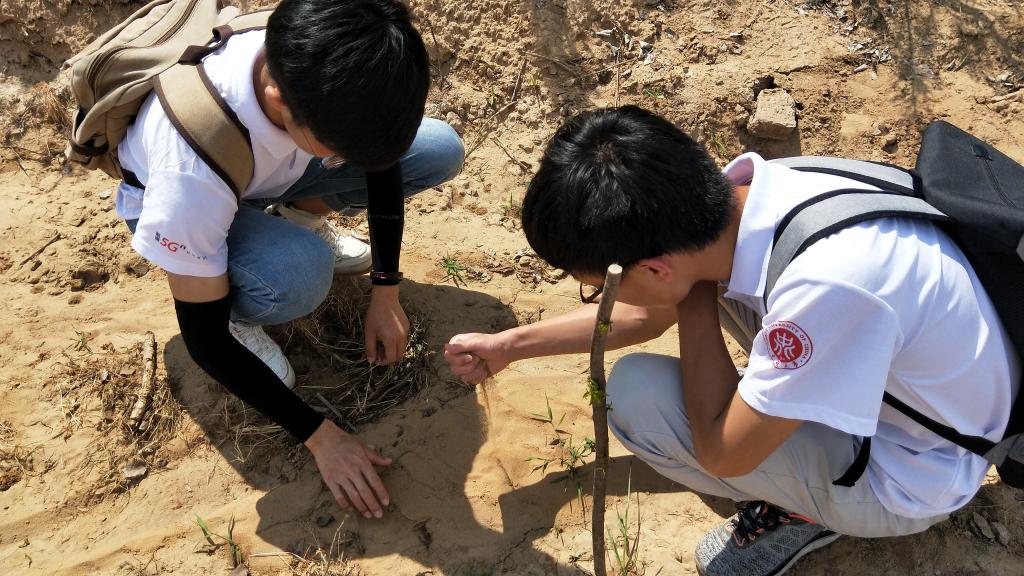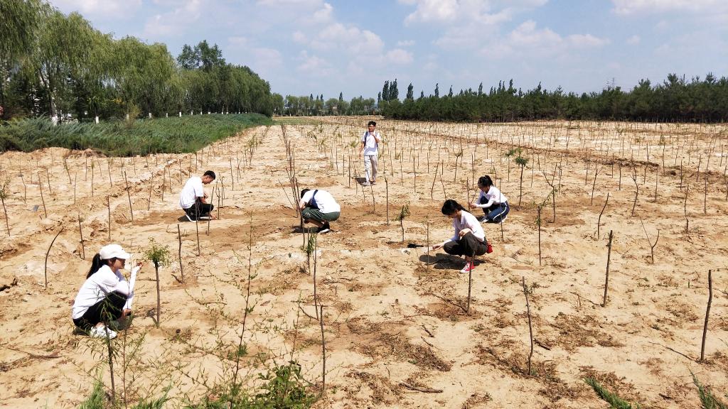 之后,王书记带着实践队队员们来到了北沙抚育区进行实地考察。数十年的艰苦奋斗,从荒漠到绿地,我们感叹小纪汗林场人员坚韧不拔的意志和不建绿洲不罢休的决心。他们将土壤运送覆盖到沙子上,种下固沙植被,用汗水浇灌绿洲的希望。通过王书记的讲述,我们了解到林业工人的艰辛。足蒸暑土气,背灼炎天光。力尽不知热,但惜夏日长。以前他们治沙时,带上鸡蛋、干粮和水一干就是一天,路途遥远,中午也不回去,就在沙地里休息。到现在才建造了这片林场,且近年来生态优化,沙土涵养了水源,只挖7~10米就可以见到水。但是,目前的治沙工作还存在一些问题,因为现在种植的多为樟子松,而樟子松油性大,容易发生火灾,所以需要研究各方面都适应沙漠的植被。