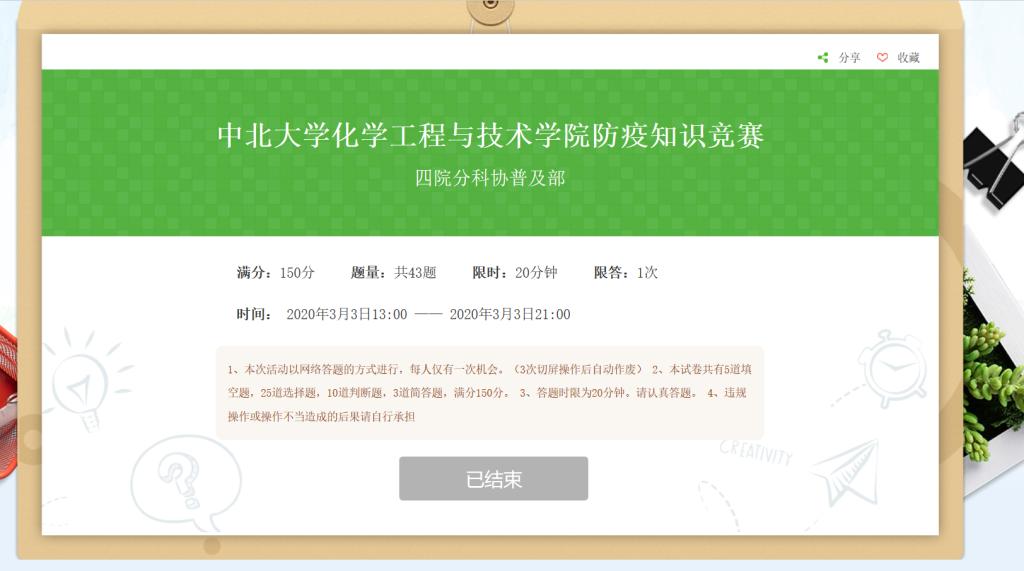科学抗击肺炎疫情,知识普及势在必行。为了增强大学生安全防疫意识,促进学生对疫情防控知识的学习。2020年3月3日,化学工程与技术学院分科协普及部举办了线上防疫知识竞赛活动。