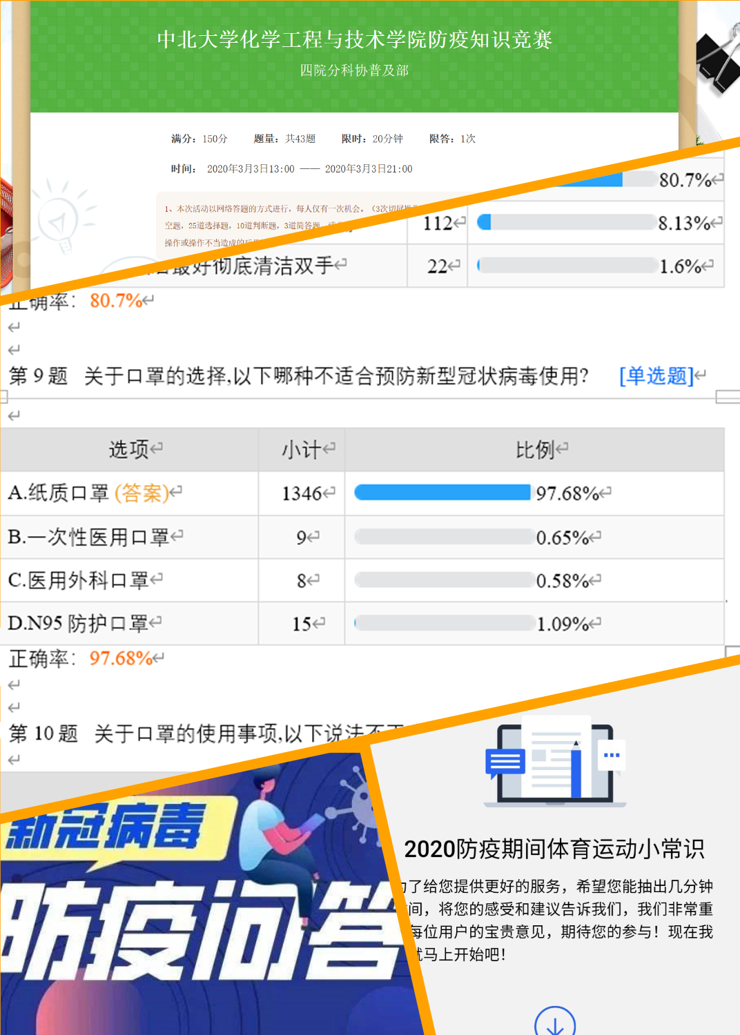 为加强新型冠状病毒防护知识科普,提高同学们的防疫意识,增进同学们对疫情的了解。化学工程与技术学院团委通过知识问答、问卷调查使同学们正确认识疫情,科学防疫。