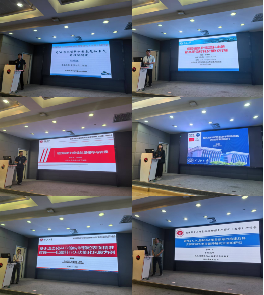杜晓强、张栋铭、郭婧、岳鲁超、杨琨、李旭飞等6位青年教师分别做了题为“光/电催化裂解水制氢气和氧气的性能研究”、“直接硼氢化物燃料电池钴基阳极材料及催化机制”、“基于流态化ALD的纳米颗粒表面精准修饰—以颜料TiO₂功能化包膜为例”、“场效应助力高效能量存储与转换”、“腔式配体配位的原子簇电催化剂还原制氨研究”、“磁性g-C3N4基铋系Z型异质结的构建及其光催化和光类芬顿降解抗生素的研究”报告,并与参会代表进行了充分交流。