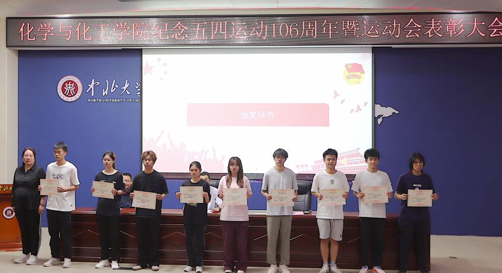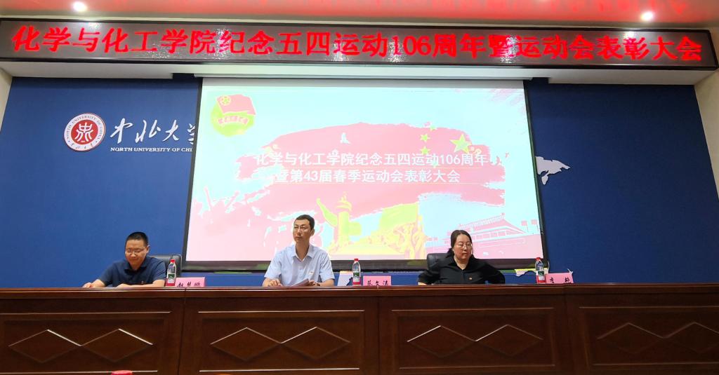 纪念五四运动106周年暨第43届春季运动会表彰大会在瑾瑜国际会议中心隆重举行。学院党委副书记蔡文涛、副院长赵慧鹏、团委书记李艳、全体辅导员老师、获奖同学及学生代表齐聚一堂,共同见证这一庄严而热烈的时刻。