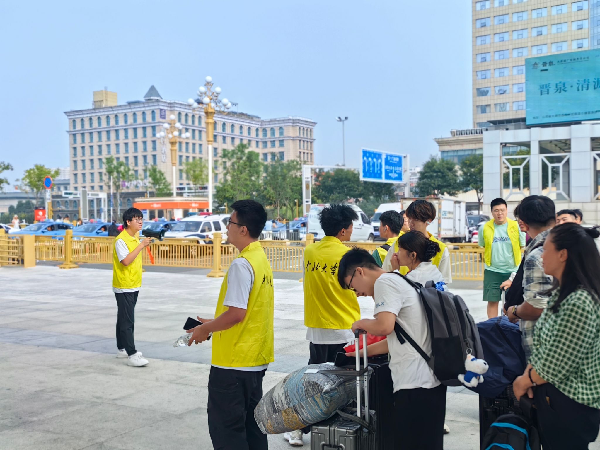 接站期间,学院郭达老师带领志愿者们坚守太原站接站服务点。每日清晨天微亮,志愿者们便已集合就位,他们身着亮黄色的工作服,手持醒目的学校接站牌,在出站口翘首以盼。志愿者们分工明确、默契配合,主动上前识别新生、热情引导至接待点、耐心解答疑问、协助搬运行李、引导新生及家长乘坐直达学校的迎新专车。一声声亲切的问候,一句句耐心的指引,一次次主动的援手,志愿者们用真诚的笑容和细致的服务,缓解新生及家长初次到来的陌生与舟车劳顿的疲惫。整个接站流程井然有序,高效顺畅。他们穿梭在车站的人群中,成为一道亮丽的“青春风景线”。