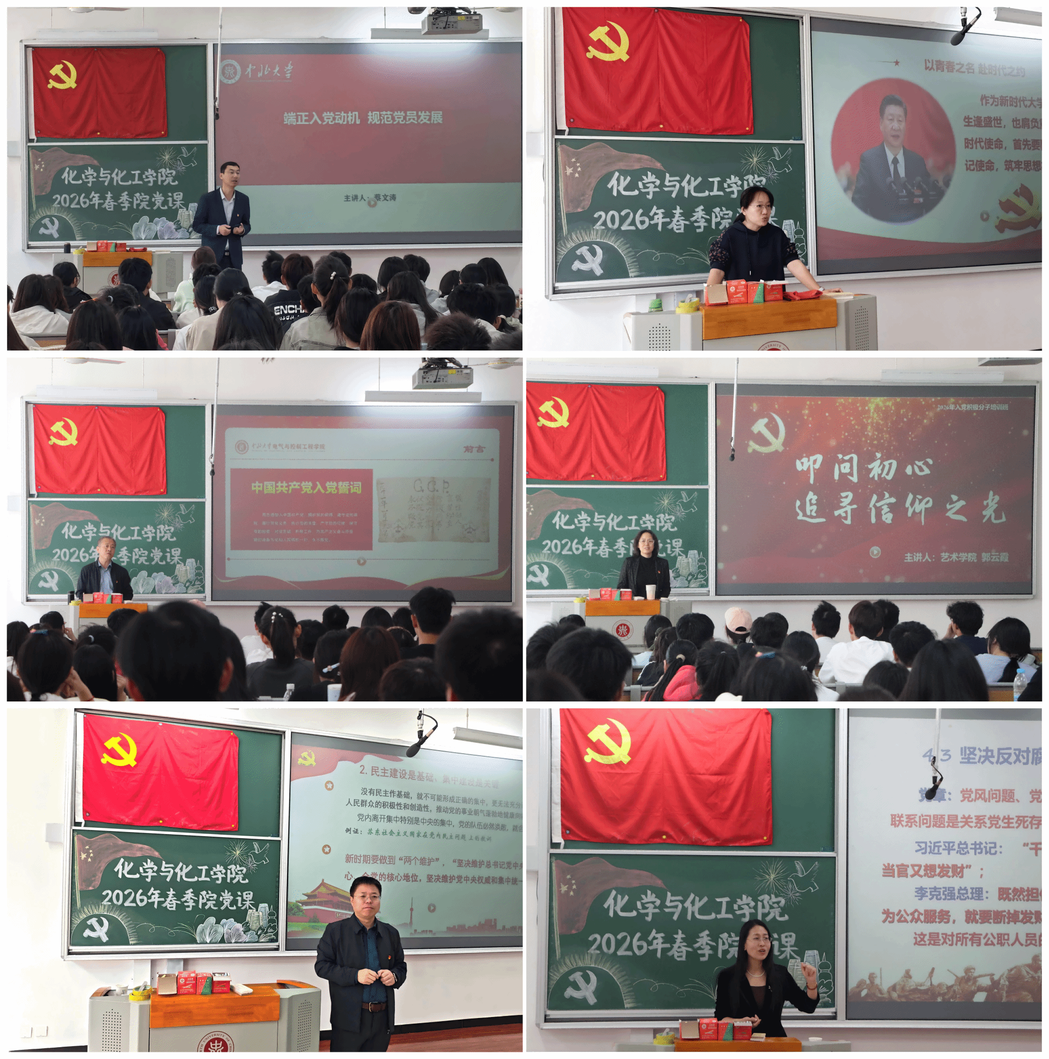 专题授课环节,蔡文涛围绕《端正入党动机,规范党员发展》开展首场专题授课,引导学员摒弃功利化思想,深刻领会“思想入党”的核心要义,牢固树立为人民服务的根本信念。学生工作部副部长魏媛媛老师以《新时代・新作为・新担当——以青春之名,赴时代之约》为题,从坚守初心使命、回望峥嵘岁月、把握时代脉搏、践行青年担当四个维度,带领学员明晰新时代青年的责任与使命。电气与控制工程学院党委书记赵正杰老师主讲《守纪律,讲规矩,做堪担民族复兴大任的新时代青年》,带领学员重温入党誓词,强调必须严守纪律规矩、恪守学风诚信。艺术学院党委书记郭云霞老师以《叩问初心,追寻信仰之光》为题,引导学员进一步端正入党动机、坚定理想信念、强化使命担当。材料科学与工程学院党委书记廖海洪老师则聚焦党的纪律建设,系统解读政治纪律、组织纪律、廉洁纪律、群众纪律、工作纪律、生活纪律“六大纪律”,结合《中国共产党纪律处分条例》明晰党员行为规范,引导学员知敬畏、存戒惧、守底线。学院组织员王立敏老师以党的根本宗旨为核心,深入阐释全心全意为人民服务的内涵,并带领学员学习民主集中制基本原则,强化组织观念与规矩意识。授课结束后,结课考试有序开展,全面检验本次培训的学习成果。