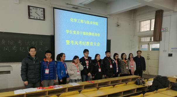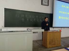 为进一步加强学风建设,严肃考风考纪,强化学生党员、学生干部责任意识,在全院形成人人自律、人人自觉、诚信应考的良好的学风环境,2018年1月5日下午,化学工程与技术学院在10102H召开学生党员、学生干部“挂牌亮身份考试”活动实施暨考风考纪教育大会。院党委副书记李云、教学副院长王海宾出席会议,学生科、教学科、各院各班主任、各班长、团支书、学习委员、全体学生党员及团委学生会干部参加会议。会议由学生科科长杨朝明主持。