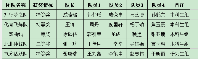 最终共有5支队伍参加了校级选拔赛(其中本科生5支队伍,研究生1支队伍),参赛获奖明细见下表。