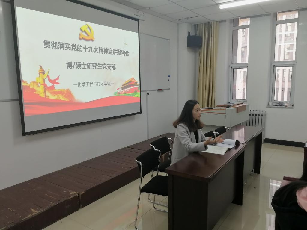 2017年11月30日,化学工程与技术学院博/硕研究生党支部于科学楼206(东)开展贯彻落实党的十九大精神的集体研讨会,传达10月18日召开的党的十九大精神内涵,推进十九大进校园、进支部、进头脑,希望在党支部内掀起学习宣传贯彻十九大精神热潮。